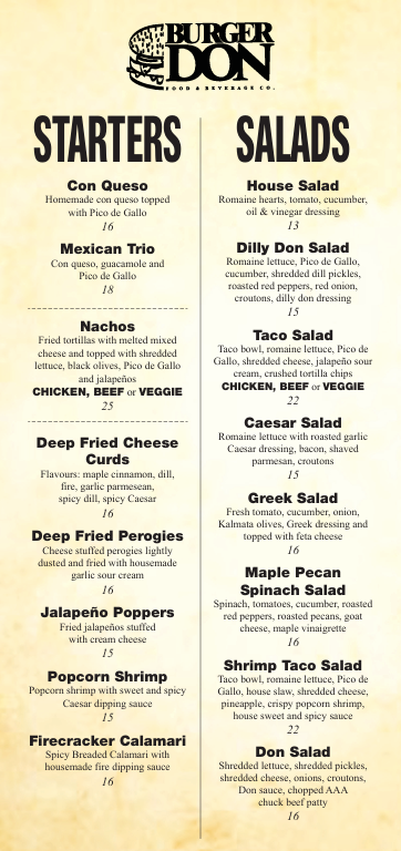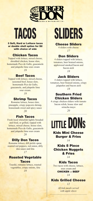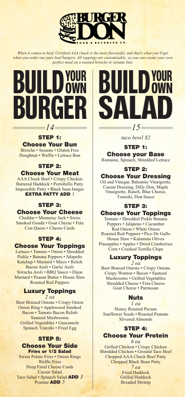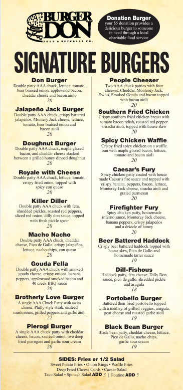 Burger Don is a prohibition-era burger joint featuring gourmet burgers, build-your-own burgers, tacos, spiked milkshakes and craft beers.