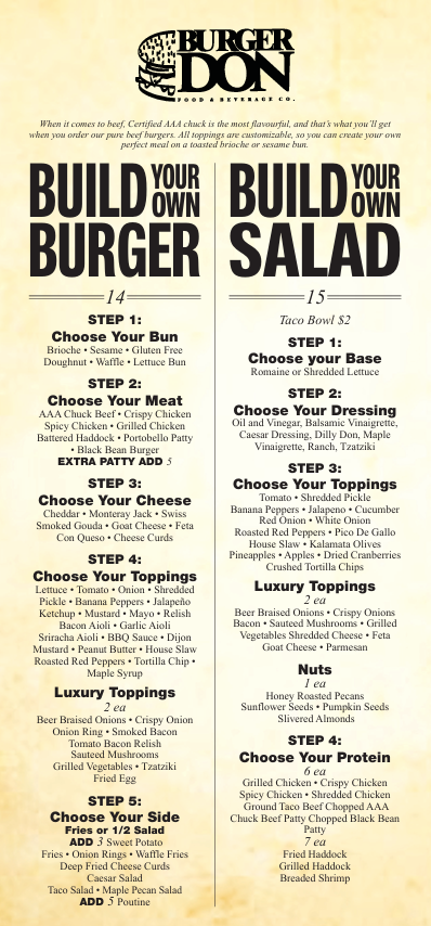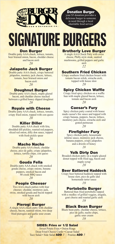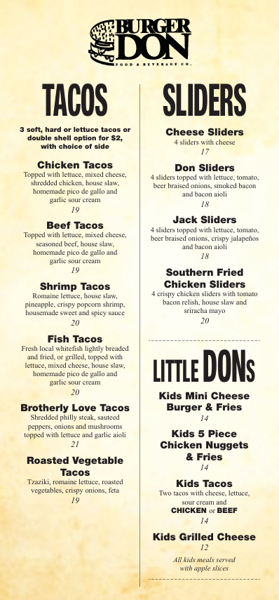 Burger Don is a prohibition-era burger joint featuring gourmet burgers, build-your-own burgers, tacos, spiked milkshakes and craft beers.